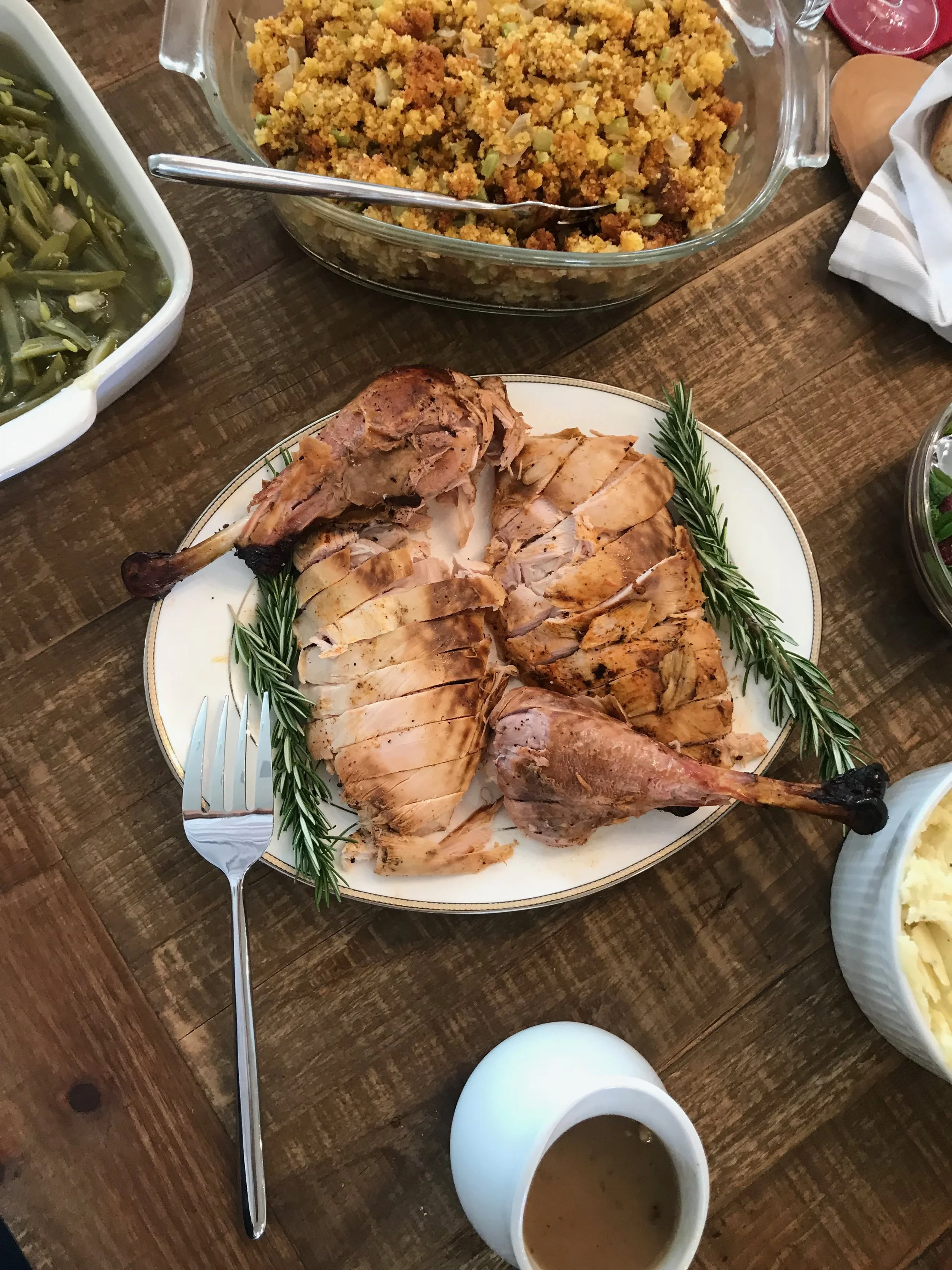 Carve the Turkey and reserve the drippings for gravy and place on an over-proof platter – pop back into a 200 degree oven to keep warm before serving.